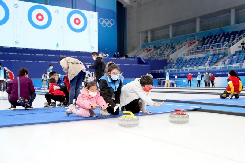在比赛场地区,不少对冰壶运动感兴趣的体验者们纷纷“下场”,其中不乏众多小朋友。“冰壶怎么这么重?”“推到哪里算终点?”大家的问题一个接一个,国家游泳中心冰场运营主管齐子楠忙着和其他同事一起为大家讲解冰壶知识,齐子楠告诉记者,场上的冰壶、这块冰面都是正式比赛期间的‘真冰真壶’,体验过的游客都感到很惊喜。
