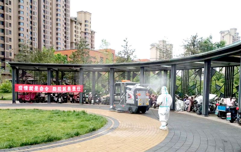物业工作人员对封控区内道路路面进行消杀 ■企业/供图