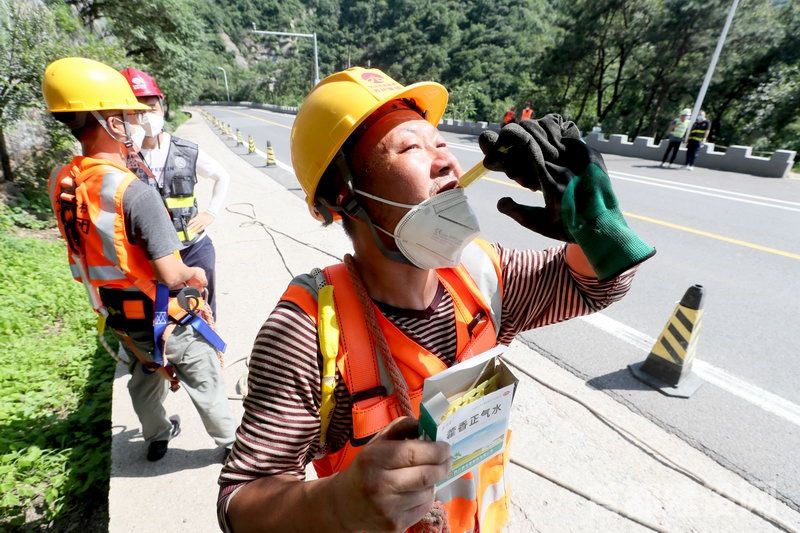 市政路桥养护集团第十公路工程处工人服用藿香正气水解暑 ■记者 周宇杰/摄