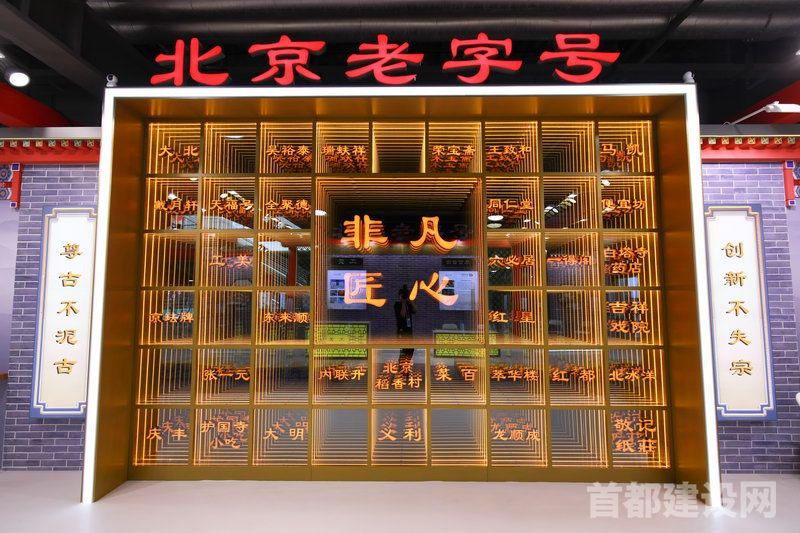 北京老字号展台以“赓续京典 老号匠心”为主题,以最具北京特色的“北京四合院”建筑为展台整体造型风格,用四合院及胡同元素体现老北京的生活百态,突出北京都城文化特色,彰显首都风范、古都风韵。