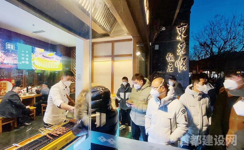 在东来顺饭庄的外卖窗口,前来购买羊肉串的顾客络绎不绝。