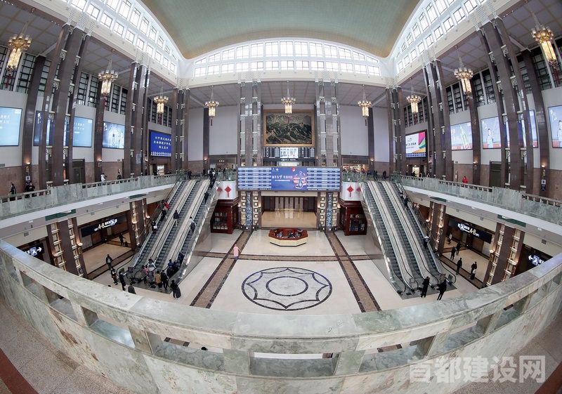 北京站中央大厅35 米高的穹顶恢复了建站时的水湖蓝色。
