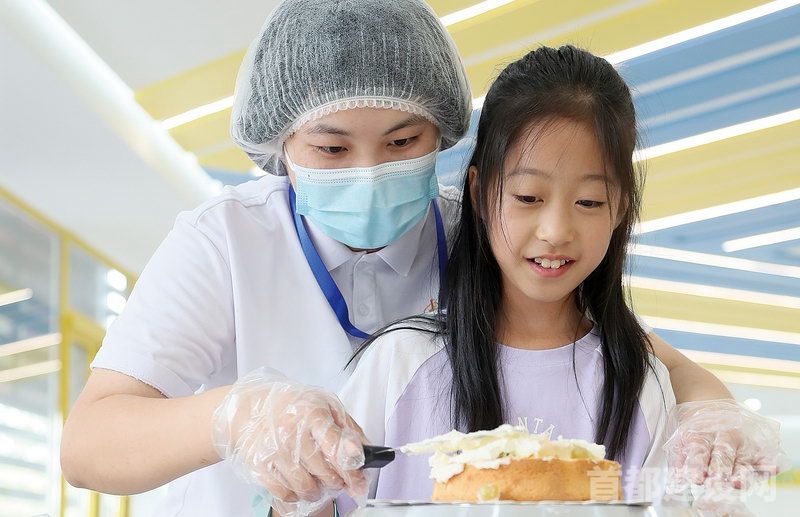 义利食品蛋糕师手把手教孩子做蛋糕裱花。