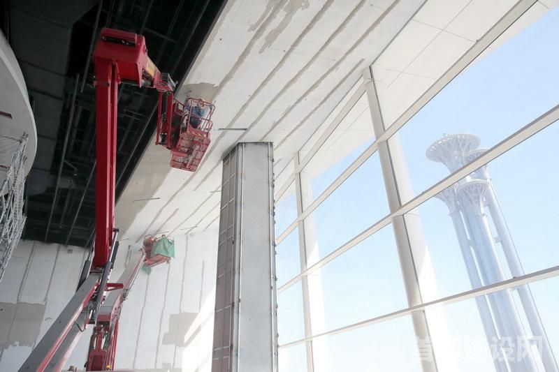 在国家会议中心二期北区施工现场,北京建工三建公司项目负责人池明智眼睛紧盯“握手厅”里正在作业的10余台曲臂升降吊车。此时吊车已经提升到20多米的高空,施工人员正在上面对刚刚安装就位的石材板块进行调整和清理工作。池明智指着上面说:“目前项目已经全面进入装修阶段,现场大约有2200名工人在各个作业面忙碌,确保整体项目于2024年底竣工交付,并于2025年投入使用。”
