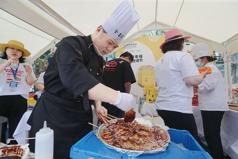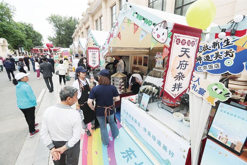 北京国际饭店的双层牛肉大汉堡、新侨饭店的炸虾排、东来顺的羊肉串和奶油炸糕、东方饭店的炒肝儿、民族饭店的团圆龙粽和提拉米苏、全聚德的烤鸭披萨……不少优质产品亮相。在coffee g咖啡馆门口,“北平红果”等3款生活节限定特调饮品海报分外显眼,北展coffee g和东来顺推出的“北平红果”成为生活节上的人气饮品,很多顾客特意坐在户外座位品尝。同时,西苑饭店的非遗漆扇和水拓文化体验也吸引了不少顾客体验。