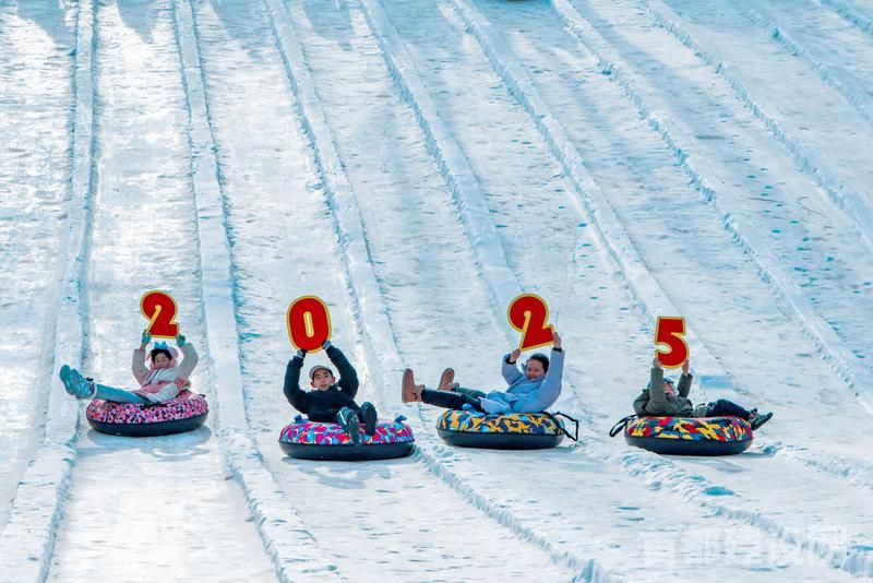 玉渊潭公园内,游客在滑雪道上手举字牌组成“2025” ■北京市公园管理中心/供图
