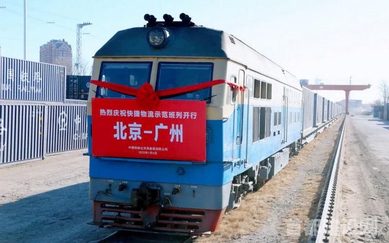 1月6日11时许,一声鸣笛后,满载43个集装箱的x8501次快速多式联运班列从北京铁路物流中心廊坊广阳货场内开出,发往丰台西站。这是北京开行的首趟铁路快捷物流示范班列。当天15时50分,该车又从丰台西站始发,前往广州常平站,预计30多个小时后,班列抵达广州常平站,实现京广之间的货物“次日达”,比普通货运班列运输时间压缩约30%。