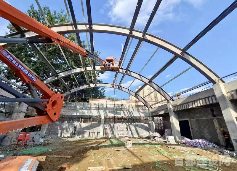 开工伊始,项目团队在屋面拆除阶段就遇到了困难,当时,拱顶区屋面跨度大,弧形屋面高度最高达10.25米,宛如卢沟桥的拱洞一般,项目团队多次召开会议研讨羽毛球馆的原建筑屋面的拆除工作,最终,采用液压剪拆除屋面,为后续项目屋面拆除施工工作打下坚实的基础。为了保证新做的900平方米钢结构屋面与原有混凝土结构精准对接,项目团队通过定制加固安装专项施工方案破局,成功啃下连接加固这块“硬骨头”,有效简化加固安装环节,实现大跨度组合钢梁构件焊接精准度100%,提升施工速度约20%。