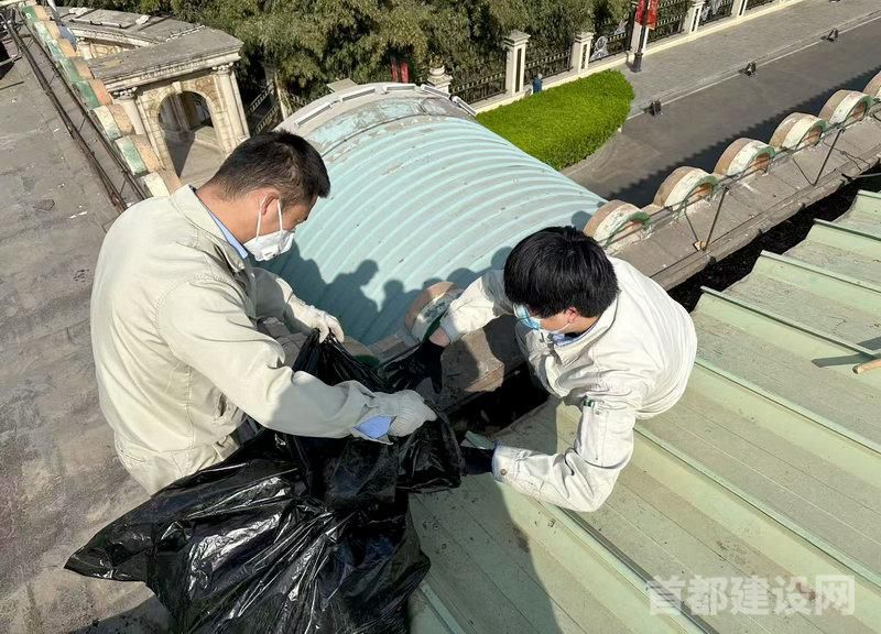 北京展览馆集团工作人员对高空石材进行隐患排查,并清理落叶             ■企业/供图