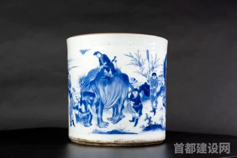 明清文人的书房中,都有什么?展出的明崇祯青花洗象图笔筒通体施白釉,釉面莹润,釉色微微泛青。腹部采用通景式构图,以青花绘人物故事图。笔筒画面以普贤菩萨为中心,他身着披肩长裙,悠然地端坐在岩石台面上,表情和善。普贤菩萨的身后立一高僧,两人一起观看、指导洗象活动。周围衬托着栏杆、树木、丛草,环境优美。远方云霭缭绕,峰峦叠嶂,群山若隐若现,烘托了祥和美好的氛围。画面情节连贯,突出了“洗象”的主题,生动反映了当时北京“伏日洗象”的社会生活习俗,象征“太平有象”“万象更新”。