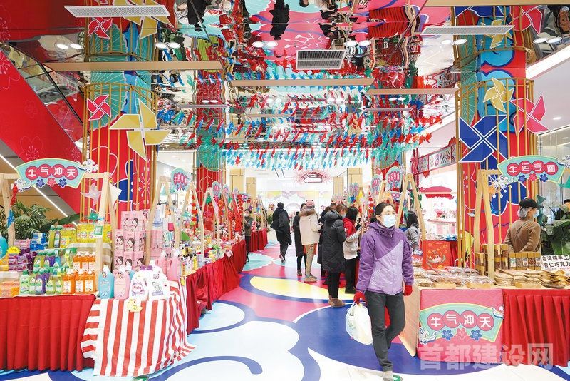 位于西长安街复兴门外的长安商场举办了新享市场,市场里彩门花廊张灯结彩,春联福字剪纸年画应有尽有 ■记者 张军/摄