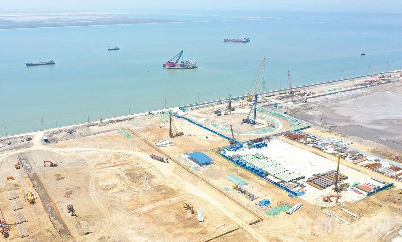 从接收站向南,码头工程正在开展码头平台及取水系统施工,未来lng将通过1.8千米的输气管道直达储气罐。外输管道工程现已扫线193.5千米,焊接184.7千米,预计今年10月底将具备投产条件。