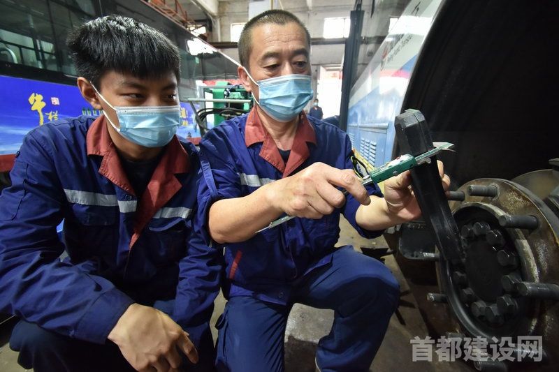 郭守田(右一)检修公交车 ■企业/供图