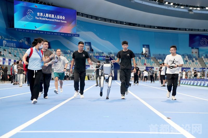 田径赛前调试中,一台能高速奔跑的机器人被“前呼后拥”着。