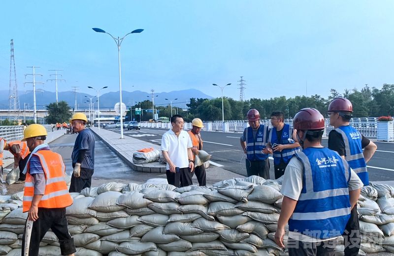 7月28日12时20分,北京建工城乡集团金河水务集团抢险队负责人高喜涛接到上级紧急指令:“密云潮河宁村新桥出现险情,立即组织力量赶赴现场!”挂断电话后,他抓起安全帽,冲出办公室。50名抢险队员听闻后即可集结,6台拖板车、4台挖掘机、2台伸缩臂抓斗车在院子里排成队列,引擎的轰鸣声与豆大的雨点声交织成出征的序曲。打通桥面泄洪通道“保持车距,注意避让!”在抢险途中,高喜涛借助对讲机不断提醒车队。13时40分,抢险队伍已在抢险点位集合完毕,随时待命。依据指挥部的部署,需将宁村新桥两侧护栏及中间隔离带进行拆除,并在桥面左右岸搭设沙